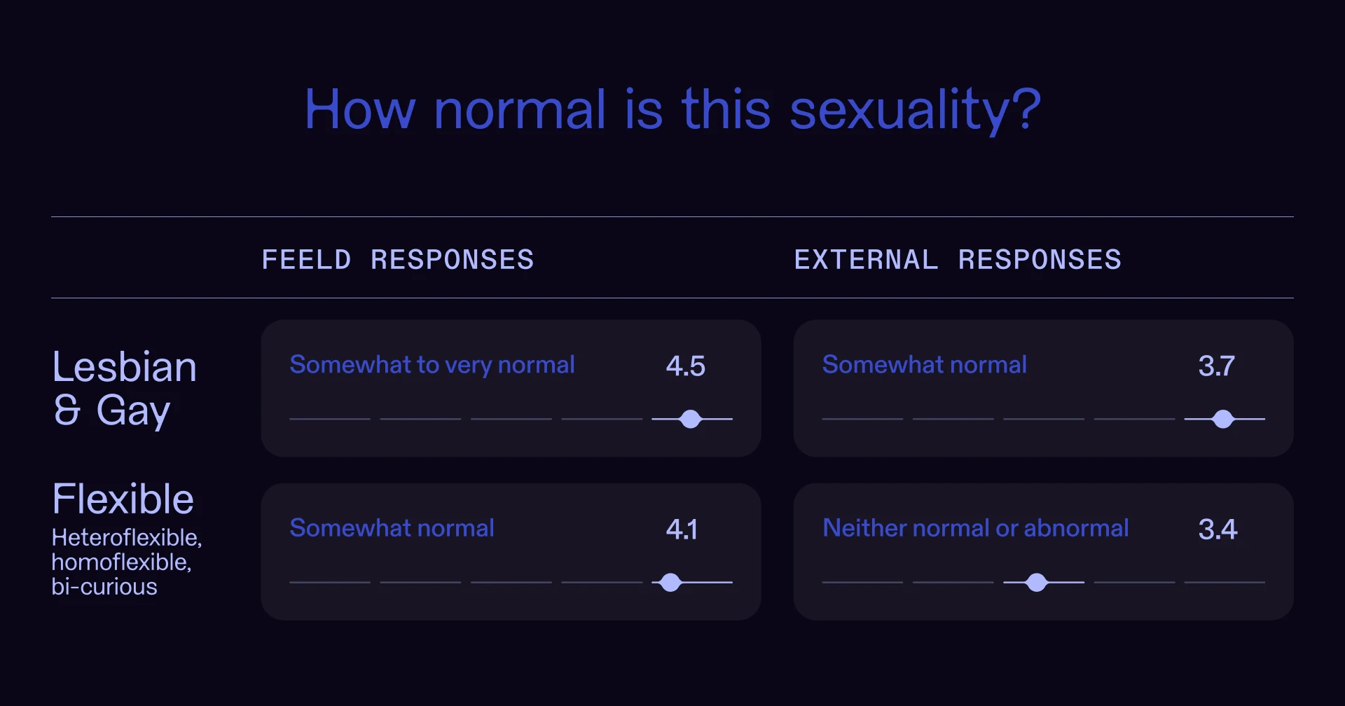 For example, while LGBTQ+ Feeld members rate themselves as somewhat normal, they accurately perceive the mainstream to be less accepting of LGBTQ+ identities. This may mean that overexposure to stigma in everyday life may influence our perception of mainstream views. In other words, those who experience, on a daily basis, marginalization in one area of identity such as sexual orientation, gender, or racial identity, become more adept at recognizing it in other cultural settings and are more inclined to resist stigma.