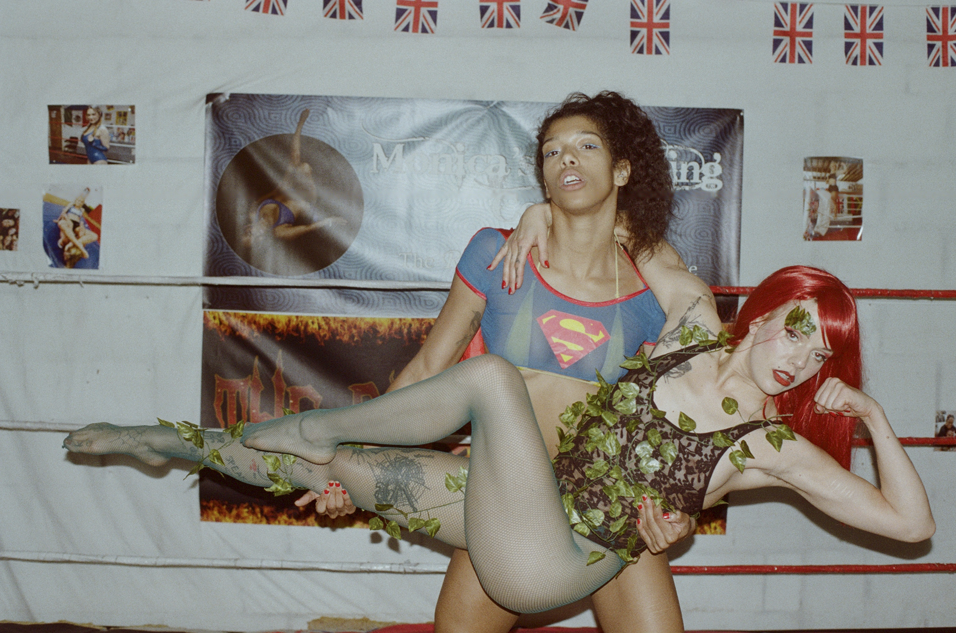 There I spotted Venus—warm and radiant—dressed in a white sports bra and shimmery black shorts. The gym is deliciously kitsch: a wrestling ring is surrounded by bright blue and red padded mats; walls draped in union jack bunting, decorated with pin-ups of butch female wrestling legends and printed photographs of amateurs. Venus told me that she keeps the exact location of the gym private to protect the safety of the performers, but the venue is well known among wrestling communities on a “if you know, you know” basis. “A big part of the events, for me, is creating a space where people can just have fun, not take themselves too seriously,” she said.